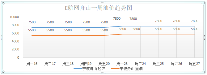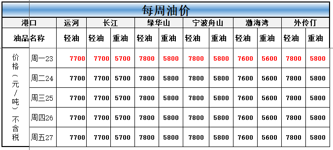 本周内外港船燃价格在周一均上调,其中轻重油均上浮300元左右。其他时间油价维持在高位暂未变动;