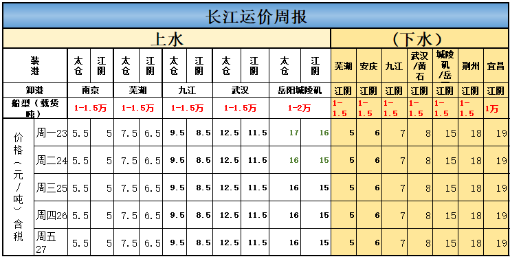 本周长江运价涨跌
