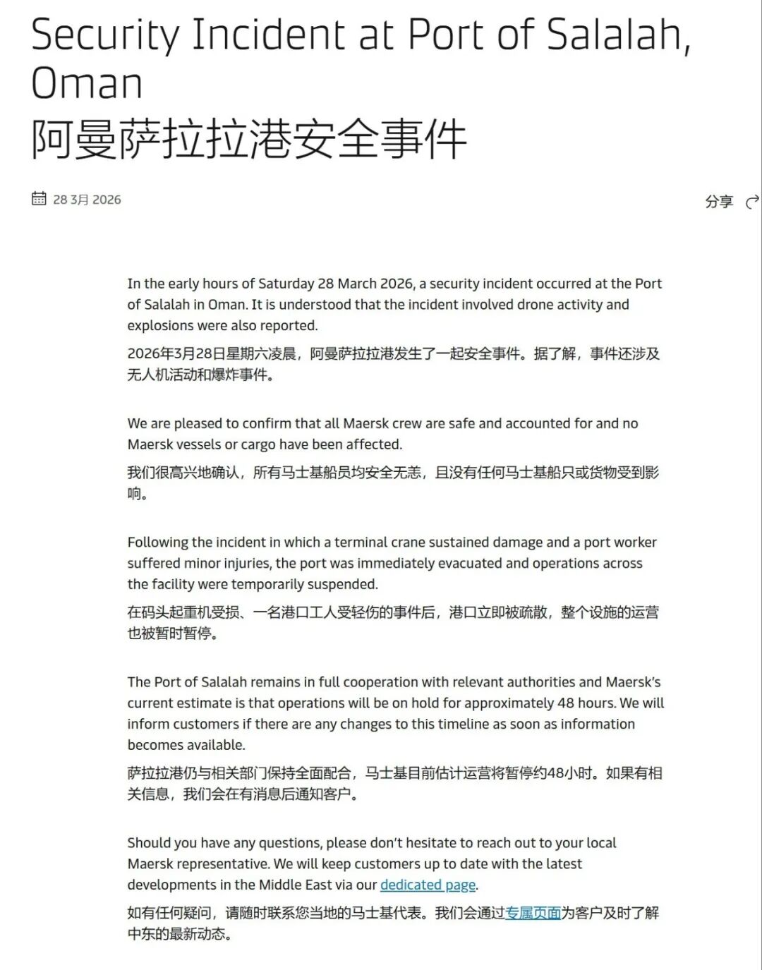 事故发生后,马士基第一时间通过官方网站发布公告,宣布暂停马士基在阿曼萨拉莱港的运营。