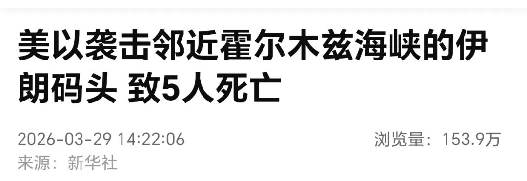 据壹航运援引新华社德黑兰3月29日最新报道:来自伊朗伊斯兰共和国通讯社报道指出,美国和以色列29日袭击了邻近霍尔木兹海峡的一个伊朗码头,造成5人死亡、4人受伤。