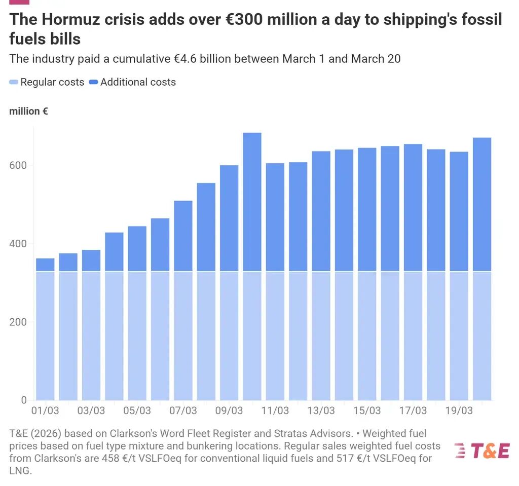 根据欧洲运输与环境联合会(T&E)发布的分析数据,自2月28日以来,全球航运企业累计已承担超过46亿欧元的额外燃料成本。作为全球能源运输“咽喉”,海湾地区局势的紧张,正在通过油价传导机制,对航运市场形成持续挤压。