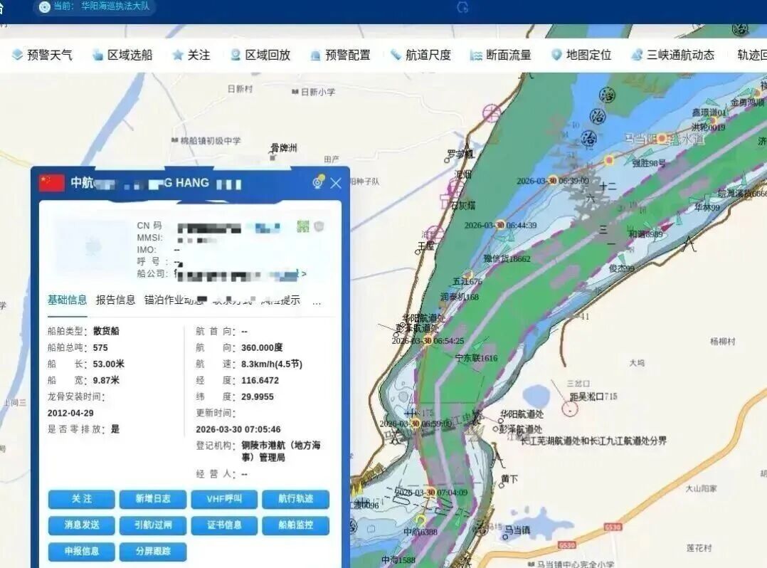 使船舶自身、船员生命及周边锚泊船舶暴露在碰撞、搁浅等重大安全风险之下;给长江水上交通安全埋下极大隐患;接获线索后;安庆海事局华阳海巡执法大队迅速响应;立即出艇赶赴现场开展违章核查