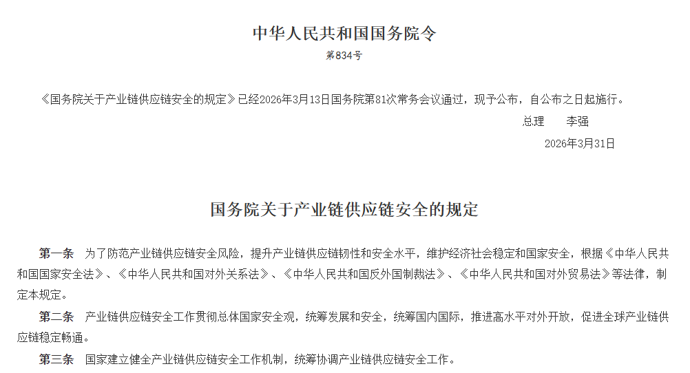 规定包括18条内容,旨在防范产业链供应链安全风险,提升产业链供应链韧性和安全水平,维护经济社会稳定和国家安全。规定明确了产业链供应链安全工作原则、建立健全产业链供应链安全制度措施以及反制措施和域外适用等内容。