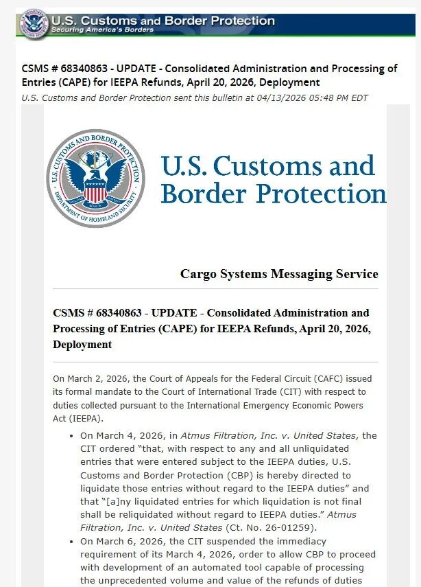 美国海关 U.S. Customs and Border Protection 已确认,针对此前依据 IEEPA 征收的关税,将于 4月20日正式启动退款流程,并以分阶段方式推进执行。