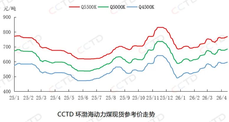 环渤海动力煤现货参考价”5500K、5000K、4500K三个规格品价格分别收于769、685、596元/吨,日环比分别上涨1、1、0元/吨。