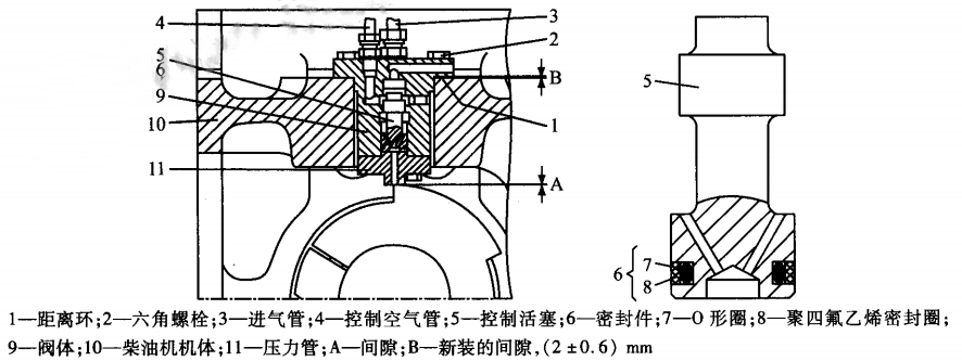 启动滑阀背面有1个泄气孔,在滑阀完成打开单缸启动阀的任务后,压力管离开启动凸轮工作段,滑阀下部的气压迅速降低,阀芯在压差的作用下落下,残留在控制空气管里的压缩空气通过启动滑阀背部的泄气孔排出。