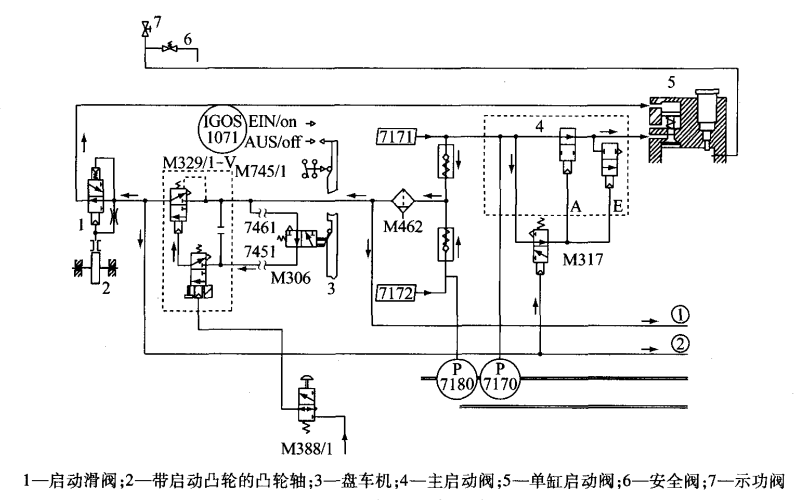 另一路到达主启动阀的控制阀M317处,推动阀芯使其下位通,这时A、E两路控制气源通过M317泄大气 ,主启动阀阀芯失去控制气源而使其上位通,接通启动空气并关闭泄气阀,使启动空气按照依次打开的单缸启 动阀进入气缸完成启动。