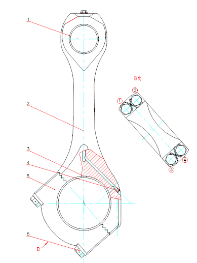 1-连杆小头衬套 2-连杆杆身 3-连杆大端轴瓦 5-连杆大端轴承盖 6-螺栓