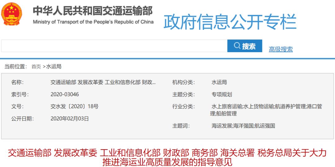 近日,交通运输部联合国家发展改革委、工业和信息化部、财政部、商务部、海关总署和税务总局联合印发了《关于大力推进海运业高质量发展的指导意见》(交水发〔2020〕18号)(以下简称《指导意见》),现将相关政策解读如下: