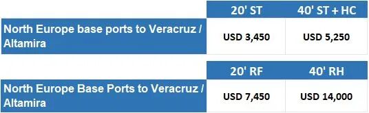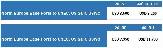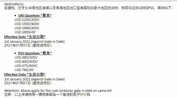 紧急燃油附加费(EBS)(适用时):每个冷藏柜500美元,每个干箱100美元/ TEU