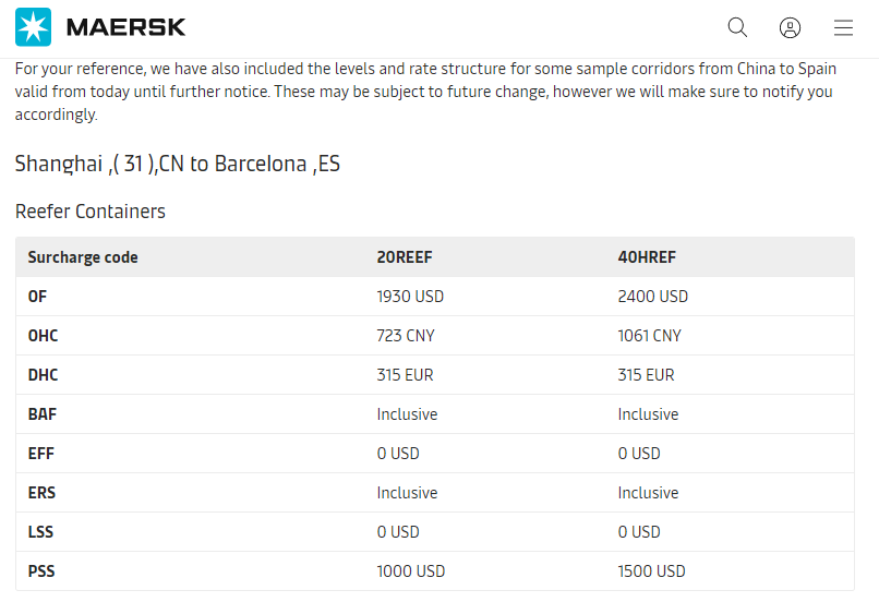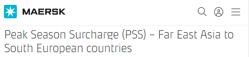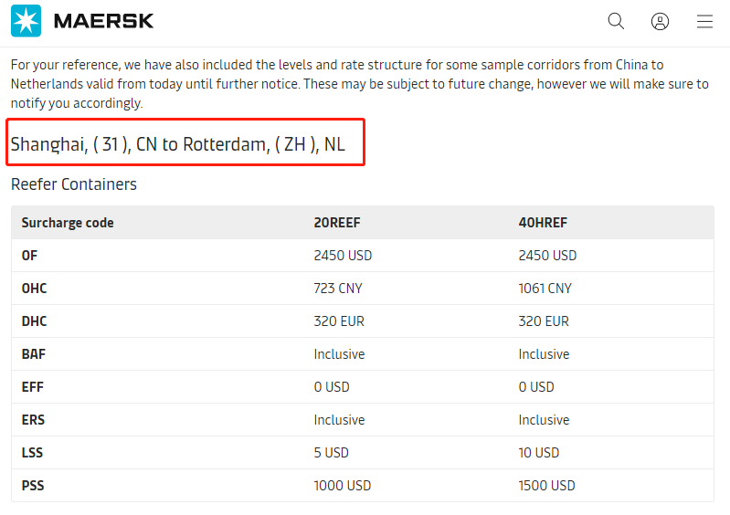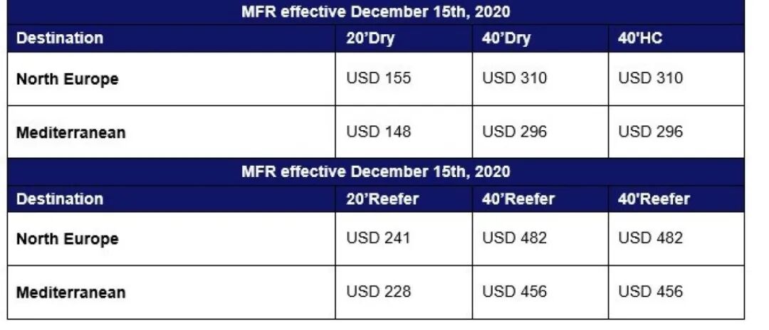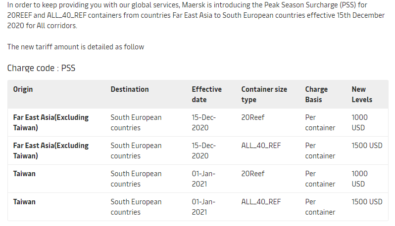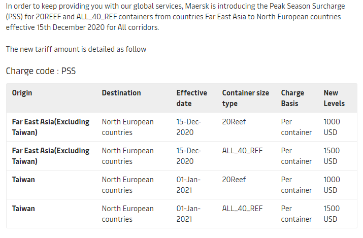 最大的航运公司马士基宣布已于12月至明年在欧洲和东亚地区征收一项新的旺季附加费(PSS)。适用于从远东到北欧和南欧国家的冷藏货物。附加费将为$1000/ 20'冷藏箱,$1500/40'冷藏箱,并将于12月15日生效,台湾PSS将于2021年1月1日生效。