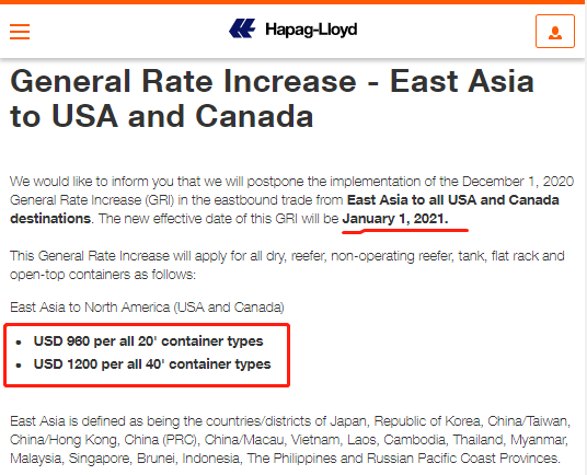 赫伯罗特征收东亚至美国和加拿大GRI费率