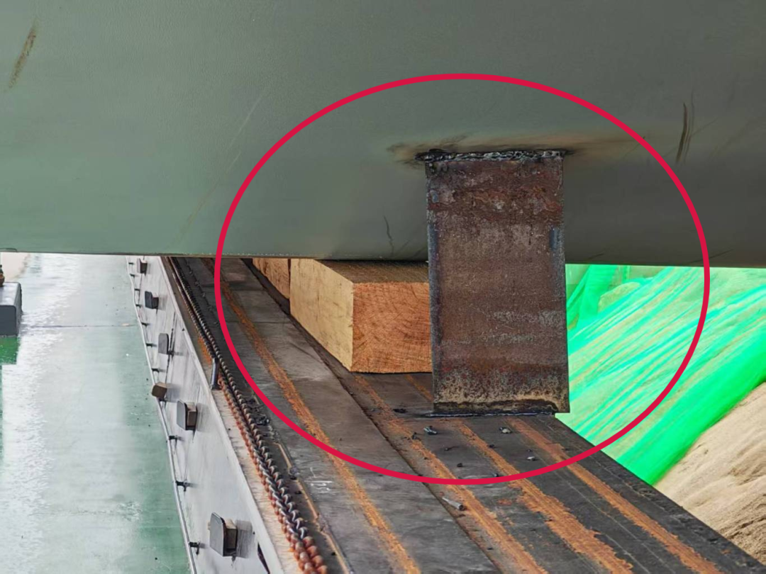 7月9日1040时许,执法人员现场巡查时发现“豫****”轮在南京长江大桥桥区下行,船上混装大件货物,载货情况异常。登轮后发现该轮为散货船,货舱装载沙子,舱口上装两个桥梁梁段,梁段与舱口围顶面通过四个焊接点固定。同时,该轮还存在连续航行时间超最低安全配员证书要求,配员不足的问题。
