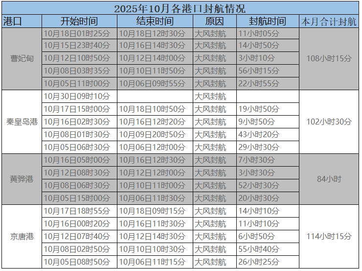 预计, 10月31日夜间至11月1日白天,东海海域、台湾海峡、台湾以东洋面、巴士海峡、南海北部部分海域、琼州海峡、北部湾将有6~7级、阵风8级的风。11月1日夜间至11月3日白天,渤海、渤海海峡、黄海部分海域、东海部分海域、台湾海峡、台湾以东洋面、巴士海峡、南海北部海域、南海中部部分海域、琼州海峡、北部湾将有6~7级、阵风8~9级的大风。2025年10月30,秦皇岛因大风封航,其他北方各大港口暂未封航: