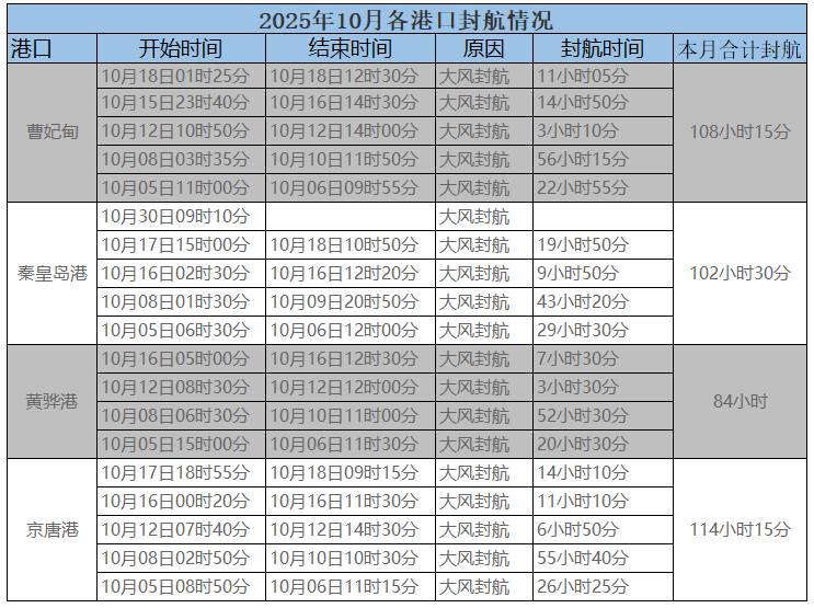 2025年10月下旬,秦皇岛因大风封航,其他北方各大港口暂未封航: