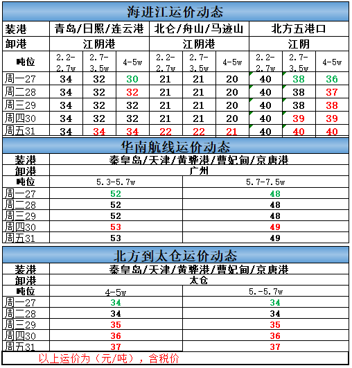 (绿色字体代表运价下调,红色字体代表上浮)