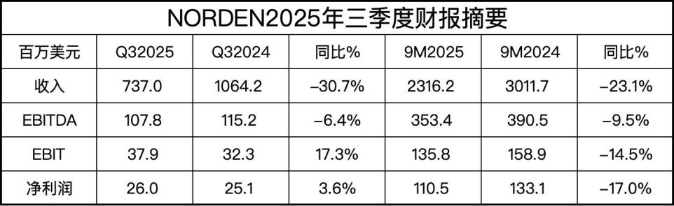 2025年前三季度,NORDEN实现营业收23.2亿美元,同比下降23.1%;EBITDA达到3.5亿美元,同比下降9.5%;EBIT为1.4亿美元,同比下降14.5%;净利润为1.1亿美元,同比下降17.0%。其中4300万美元来自集团的综合营业利润,6800万美元来自销售收益。