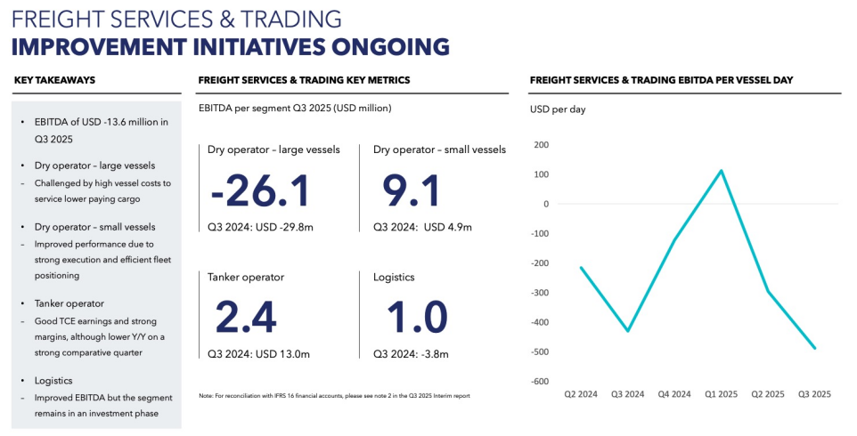 按业务板块来看,NORDEN指出,受到现货市场挑战和高期租租金成本的挤压,专注于运输服务的“Freight Services & Trading”部门在三季度EBITDA为亏损1360万美元,与去年同期亏损1570万美元相比略有改善。
