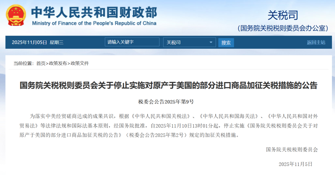 航运界网消息,11月5日,国务院关税税则委员会发布公告,为落实中美经贸磋商达成的成果共识,根据《中华人民共和国关税法》、《中华人民共和国海关法》、《中华人民共和国对外贸易法》等法律法规和国际法基本原则,经国务院批准,自2025年11月10日13时01分起,停止实施《国务院关税税则委员会关于对原产于美国的部分进口商品加征关税的公告》(税委会公告2025年第2号)规定的加征关税措施。
