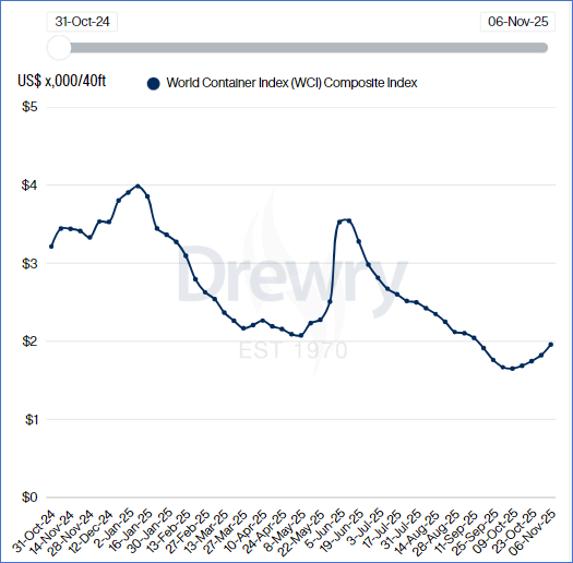 与此同时,截至11月6日,Drewry世界集装箱运价指数(WCI)环比上涨8%,达到1959美元/FEU。