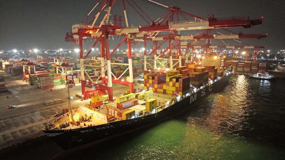 11月7日18:00,伴随悠长的汽笛声,地中海航运(MSC)全新推出的SAMBAR航线(地中海东南亚航线)首班船舶——“地中海迪亚哥”轮顺利靠泊山东港口青岛港前湾集装箱码头,将满载化工品、机电产品及新鲜蔬果等物资,直航越南、泰国、马来西亚等国家。这标志着青岛港正式开通东南亚直达航线,构建起“中国北方—东南亚”的直连物流新通道。至此,青岛港今年新增集装箱外贸航线已达17条。