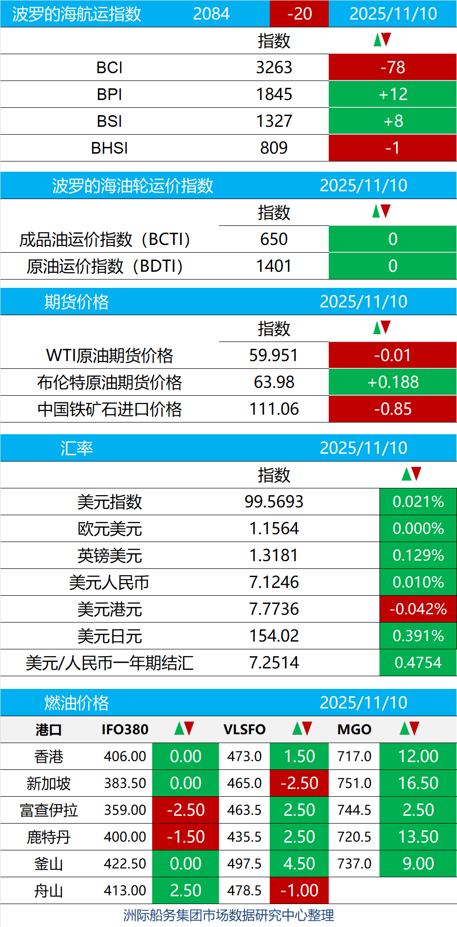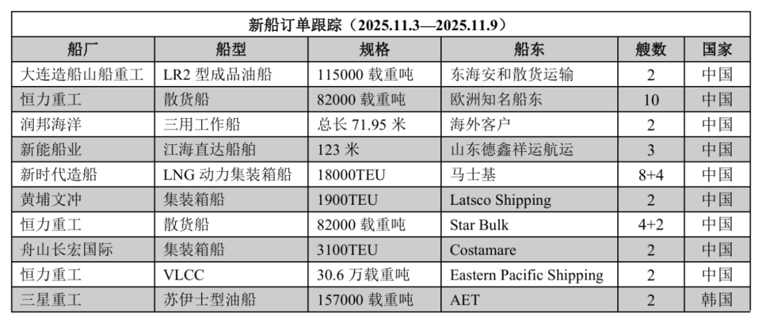 航运新闻早知道 2025.11.11 2025-11-11 N EWS 综合资讯 1、【建造】据悉,Star Bulk与恒力重工签署了4+2艘82000载重吨Kamsarmax型散货船建造合同,新船将配备脱硫装置,预计在2026年至2027年间陆续交付。船舶经纪人估计,每艘新船造价在3600万至3800万美元之间,备选订单生效后6艘新船总价值约2.16亿美元至2.28亿美元(约合人民币15.39亿元至16.24亿元)。 据悉,地中海航运最近与广船国际签署了2+2艘3500车道米LNG双燃料客滚船建造合同,每艘可搭载多达2500名乘客。预计新船单价超过1.6亿美元,备选订单确认生效后合同总金额约为6.4亿美元(约合人民币46.6亿元)。据悉,地中海航运最近与广船国际签署了2+2艘3500车道米LNG双燃料客滚船建造合同,每艘可搭载多达2500名乘客。预计新船单价超过1.6亿美元,备选订单确认生效后合同总金额约为6.4亿美元(约合人民币46.6亿元)。据悉,地中海航运最近与广船国际签署了2+2艘3500车道米LNG双燃料客滚船建造合同,每艘可搭载多达2500名乘客。预计新船单价超过1.6亿美元,备选订单确认生效后合同总金额约为6.4亿美元(约合人民币46.6亿元)。 2、【开工】11月8日,浙江海建港航工程有限公司投资建造的3000M³级耙吸挖泥船开工仪式在舟山宁兴船舶修造有限公司北仑环海基地隆重举行。 3、【合同】11月7日,三星重工宣布与一家北美船东签订2艘原油运输船建造合同,订单价值2901亿韩元(约1.994亿美元),预计将于2029年1月前陆续交付船东。加上最新订单,今年截止目前,三星重工已承接32艘、价值约56亿美元的新船订单。 4、【试航】近日,由江苏大洋海洋装备有限公司(航天大洋)为华夏金租建造的15000吨多功能海缆施工船“华夏德京108”号(DYOE001)正式开启出江试航任务。“华夏德京108”轮是目前全球单缆盘载缆量最大的海缆施工船。 5、【加注】11月7日,继一年多前顺利实现福建省首单船用生物燃料油成功加注后,厦门港再次迎来首单国际航行船舶保税液化天然气(LNG)“船对船”加注作业。这也意味着厦门港形成了“生物燃料油+LNG”的多层次清洁能源供给能力,绿色港口服务体系更趋完善。 6、【订单】据国际船舶网跟踪:2025年11月3日至2025年11月9日,全球船厂共接获37+6艘新船订单。其中中国船厂接获35+6艘新船订单;韩国船厂接获2艘新船订单。 7、【合并】11月4日,常石造船在官网宣布,该公司已于2025年11月1日完成集团内部重组,旗下常石三保造船株式会社(TSUNEISHI MIHO SHIPBUILDING)与新潟造船株式会社(NIIGATA SHIPBUILDING & REPAIR)已合并为常石三保造船株式会社。 D ATA 航运指数 来源:洲际船务 所有文章未经授权禁止转载、摘编、复制或建立镜像,违规转载法律必究。