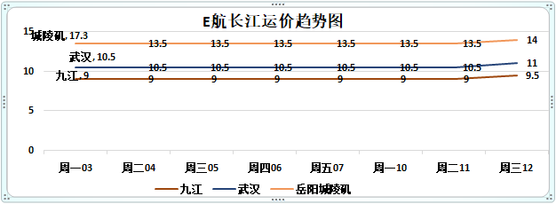 周三长江上水九江、武汉、岳阳运价上浮0.5元;其他各航线运价继续维持稳定。