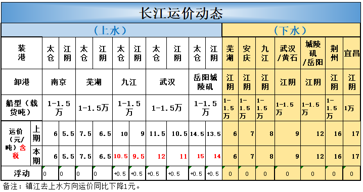 江阴到九江运价上涨0.5元为9.5元/吨;