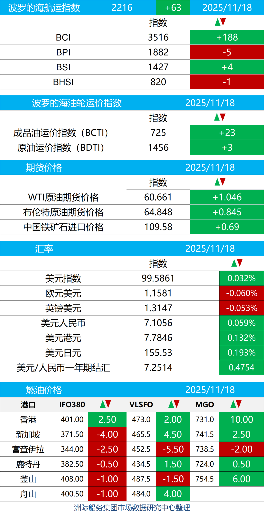 航运新闻早知道 2025.11.19 2025-11-19 N EWS 综合资讯 1、【建造】据悉,西非液化天然气生产巨头——尼日利亚液化天然气公司(NLNG)的航运子公司邦尼燃气运输(BGT)确定由沪东中华造船承建3+3艘LNG运输船。确认订单的3艘新船预计2029年交付。 据悉,地中海航运最近与广船国际签署了2+2艘3500车道米LNG双燃料客滚船建造合同,每艘可搭载多达2500名乘客。预计新船单价超过1.6亿美元,备选订单确认生效后合同总金额约为6.4亿美元(约合人民币46.6亿元)。据悉,地中海航运最近与广船国际签署了2+2艘3500车道米LNG双燃料客滚船建造合同,每艘可搭载多达2500名乘客。预计新船单价超过1.6亿美元,备选订单确认生效后合同总金额约为6.4亿美元(约合人民币46.6亿元)。据悉,地中海航运最近与广船国际签署了2+2艘3500车道米LNG双燃料客滚船建造合同,每艘可搭载多达2500名乘客。预计新船单价超过1.6亿美元,备选订单确认生效后合同总金额约为6.4亿美元(约合人民币46.6亿元)。 2、【合同】11月17日,HD现代旗下造船中间控股公司HD韩国造船海洋宣布,该公司近日与一家大洋洲船东签订2艘化学品船建造合同,订单总价值约2194亿韩元(约1.5亿美元),单船造价约7500万美元。 3、【交付】11月17日,苏美达船舶旗下新大洋造船为阿联酋船东Emarat建造的皇冠63 3.0版本散货船“DUBAI SKY”号顺利命名交付。 4、【命名】11月13日,大连中远海运川崎为丹麦NORDEN航运公司建造的6.4万载重吨散货船“Metis Stellar”轮(DE163)命名仪式成功举行。 5、【签订】据悉,Venergy Maritime已与新时代造船签订2艘115000载重吨阿芙拉型油轮建造意向书,预计将于2029年交付,预估单船造价约6900万美元。 6、【加装】近日,总部位于英国的风力推进技术供应商Anemoi Marine Technologies完成了全球最大型矿砂船“NSU Tubarao”号旋筒风帆(转子帆)的加装工程。该船加装了5套35米高的旋筒风帆系统,预计每年可降低6%-12%的燃料消耗。 7、【订造】11月12日,长荣海运股份有限公司发布公告称,其子公司Evergreen Marine(Asia)董事会决议在中韩船厂订造共计14艘14000TEU LNG双燃料动力集装箱船,总价约24.5亿美元至28.7亿美元。根据公告,上述订单中将由广船国际和三星重工各建造7艘。 D ATA 航运指数 来源:洲际船务 所有文章未经授权禁止转载、摘编、复制或建立镜像,违规转载法律必究。