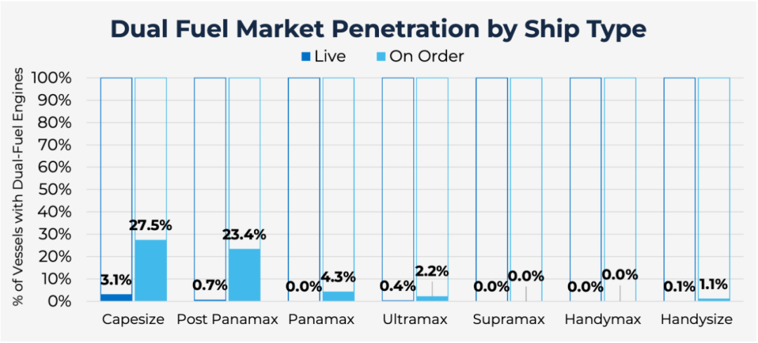 这使得好望角型船成为所有商用船型中双燃料转型 速度最快的板块。