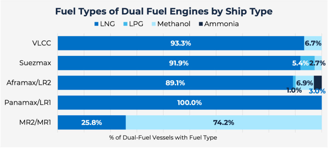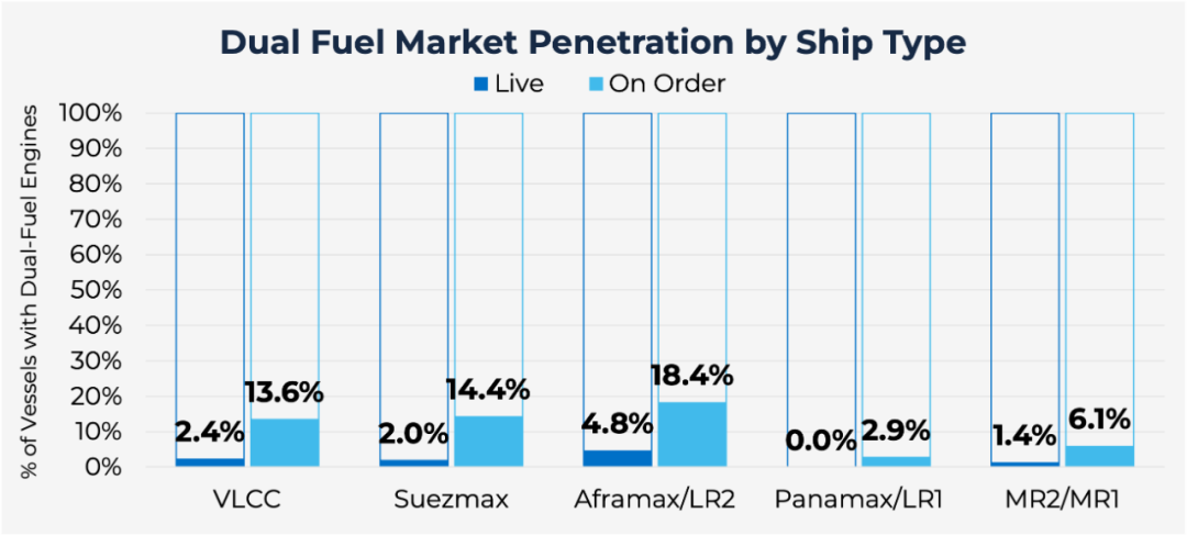 油轮现役船队中双燃料的渗透率仍然很低——依船型不同,在 0% 至 4.8% 之间——但订单数据揭示了另一番景象。