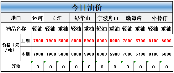 长江运河轻油价格今天维持不变。外港轻重油价格今天暂维持不变。具体见下表。