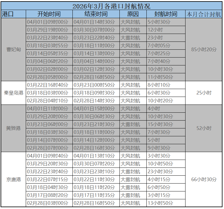 2026年4月2日,近期除秦皇岛港外北方各大港口均有短时大风封航,具体如下。