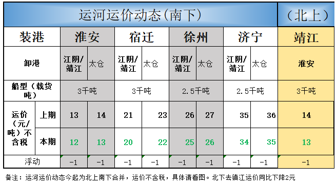 运河运价分析主要基于具有行业一定权威性的多家船东提供出来的运价数据,仅供参考。