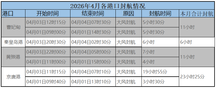 2026年4月7日,近期北方各大港口均有短时大风封航,具体如下。